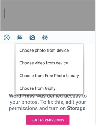 3、单击“添加”按钮将图像添加到您的博客文章中。该应用程序允许您使用手机的相机或WordPress媒体库上传设备中的图像