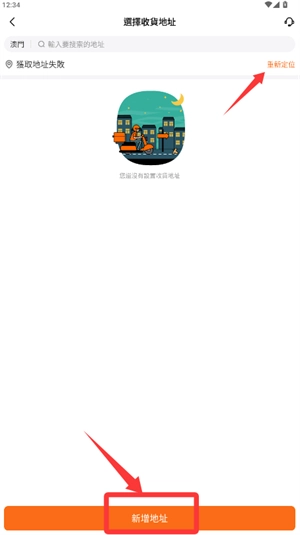 1、首先在收货地址页面,若定位失败则点击重新定位或新增地址。