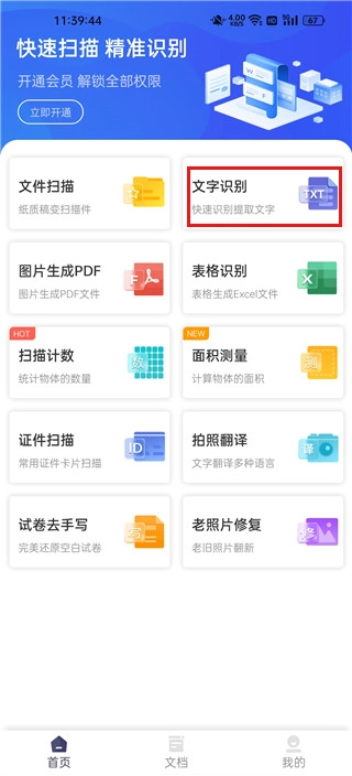1、打开软件,可以看到软件的功能非常的丰富,有文件扫描、文字识别、图片转pdf、表格识别、试卷去手写、炮制翻译等功能,这里小编以文字识别为例