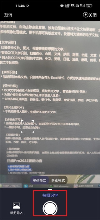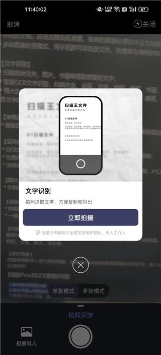 3、从图可以看到拍照识字有两种模式,分别是单张模式和多张模式,这里小编选择单张模式为例