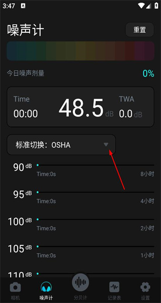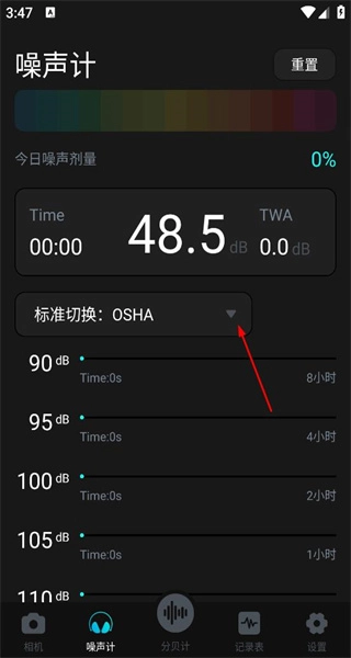 1、启动软件后,进入噪声计界面,查看当前的分贝数值,点击标准切换选项以了解不同的标准设置。