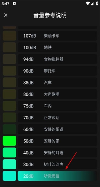 4、进入词汇说明详情页面后,可查看不同场景所对应的分贝参考数值,从而了解各类音量在实际生活场景中的对应情况。