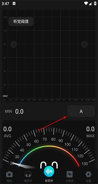 2点击底部的分贝计导航选项,进入对应的功能界面后,可查看听觉阈值相关图表以及分贝仪表盘上的各项数据。