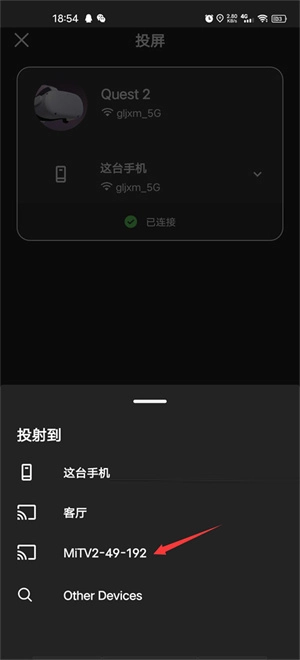 第二步,打开手机上的Oculus软件,将其与你的头盔连接,连接成功后,点击右上角的投屏按钮。