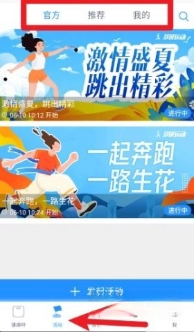 3进入“活动”页面后,可浏览平台推荐的热门内容、精心筛选的优质活动,以及自己创建的运动项目,这样能更方便地参与各类挑战,从而赢取相应的奖励。