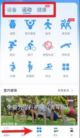 2进入主页后,点击“运动”分类标签,即可浏览减肥、跑步、游泳等多种训练项目,分类系统一目了然,方便用户快速定位所需内容。