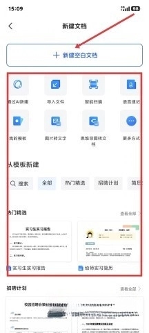 2、新建文档页提供空白文档、AI新建等多种方式,并支持导入文件与智能扫描,模板库涵盖实习报告、简历等热门类型,帮助用户快速开启文档创作。