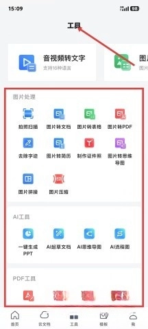 3、工具页集成了音视频转文字、图片处理等多种功能,使用拍照扫描可以快速提取文字,AI工具一键生成PPT或起草文档,帮助用户高效处理各种文件需求。
