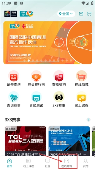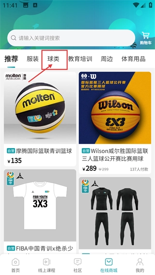 1、在主界面底部导航栏找到【在线商城】入口并点击,进入商城页面,可查看各类篮球相关商品。