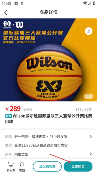 3、在球类商品列表中,可选择目标商品(如【Wilson威尔胜国际篮联三人篮球公开赛比赛用球】),点击进入商品详情页。