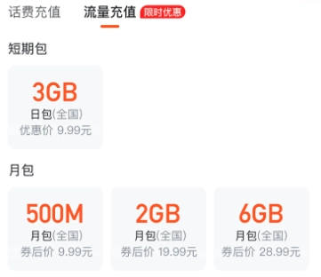 充流量:短期包,月包,定向包充值享优惠