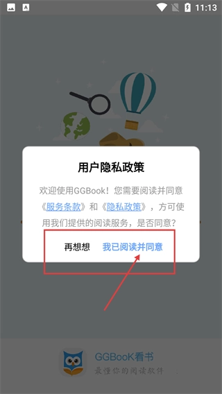 1、进入应用时会弹出《服务条款》《隐私政策》确认弹窗,点击【我已阅读并同意】按钮,即可进入应用的阅读偏好选择页面。