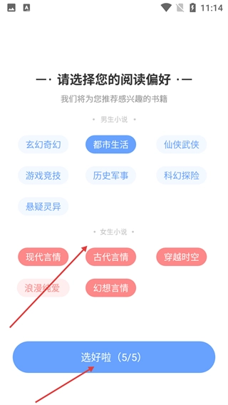 2、阅读偏好选择页面包含“男生小说”“女生小说”两大分类,提供玄幻奇幻、都市生活、现代言情等多种题材选项,用于个性化书籍推荐。