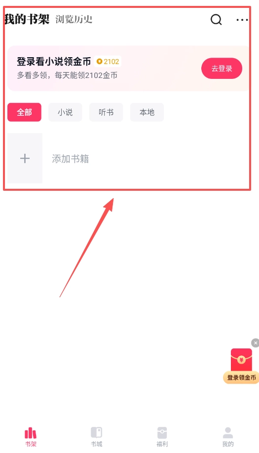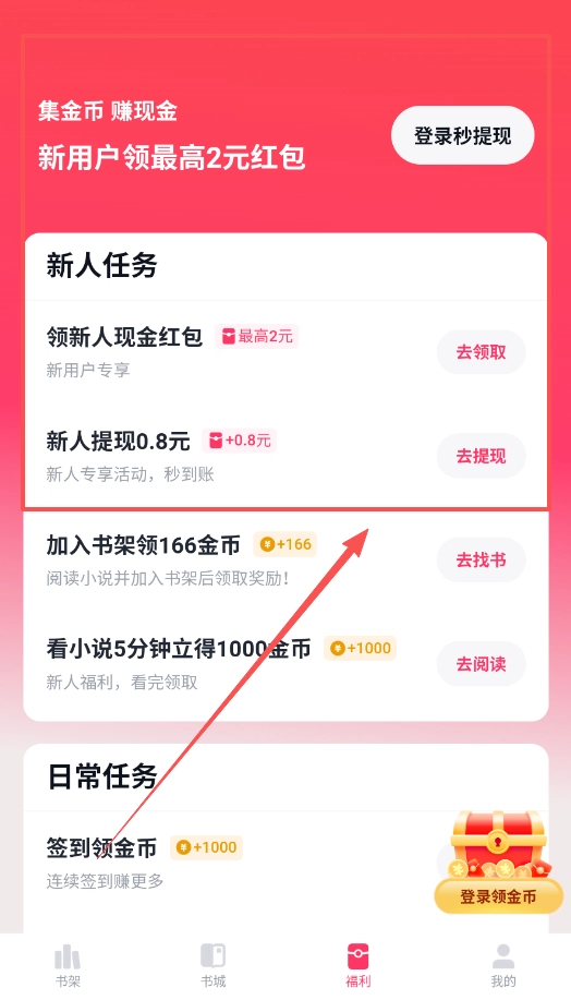 1、首先打开软件后完成账号登录,在首页能看到登录看小说领金币的提示,登录后在福利页面还能参与新人任务。