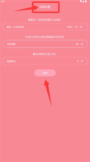 2、在经期设置页面,填写最近一次月经时间及周期等信息。