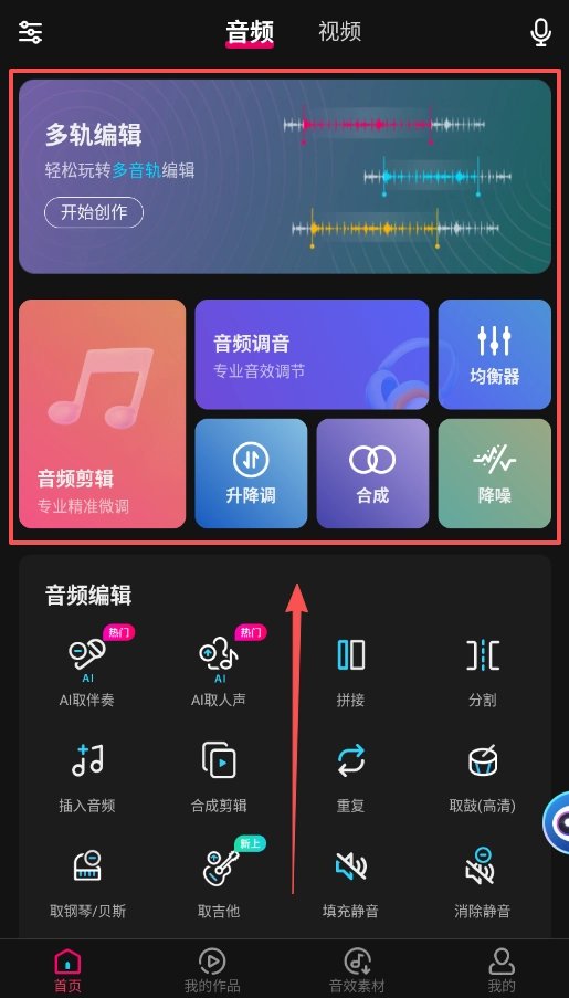 2、然后回到首页点击"开始创作",进入多轨编辑界面,你可以先尝试导入一段音频,,熟悉核心操作流程。
