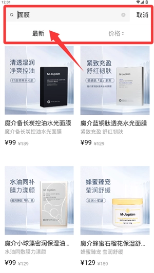 3之后在搜索栏中输入面膜相关的搜索词,再根据最新发布时间或者商品价格这两个条件来进行筛选操作。