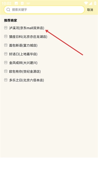2、在搜索结果里找到你要找的商家(比如【泸溪河(京东mall双井店)】这类),点击进入该商家的详情页面。