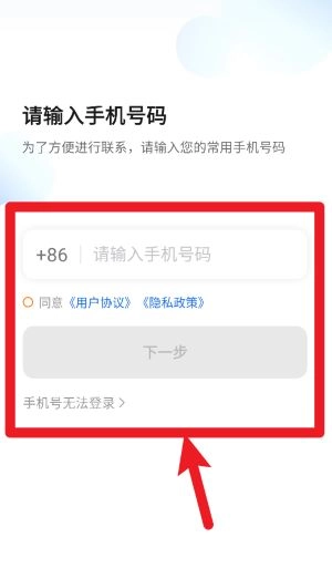 1、打开之后,首先输入您的常用手机号码,并勾选同意用户协议和隐私政策才能进行下一步操作。