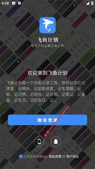1在“飞鱼计划”的登录界面中,点击手机图标选项,即可切换到手机号登录的操作页面,进而选择该方式完成账号登录。