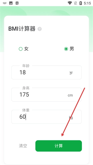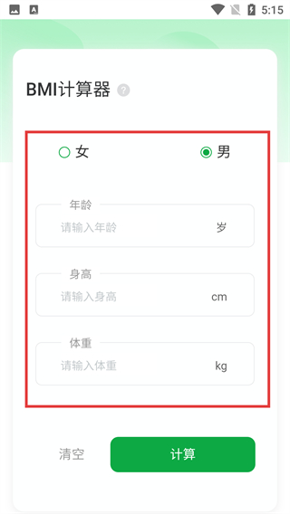 2在BMI测算界面选定性别后,接着把年龄、身高、体重这些对应的内容逐一填好,为后续的计算步骤做准备。
