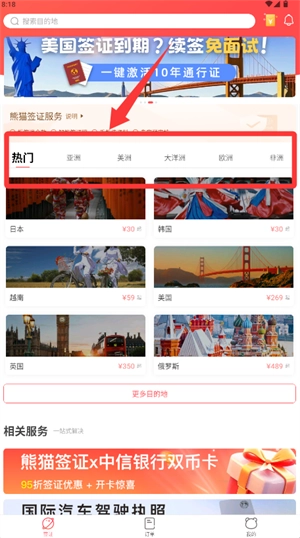 2、在首页根据大洲分类或热门推荐,选定需要办理签证的国家。