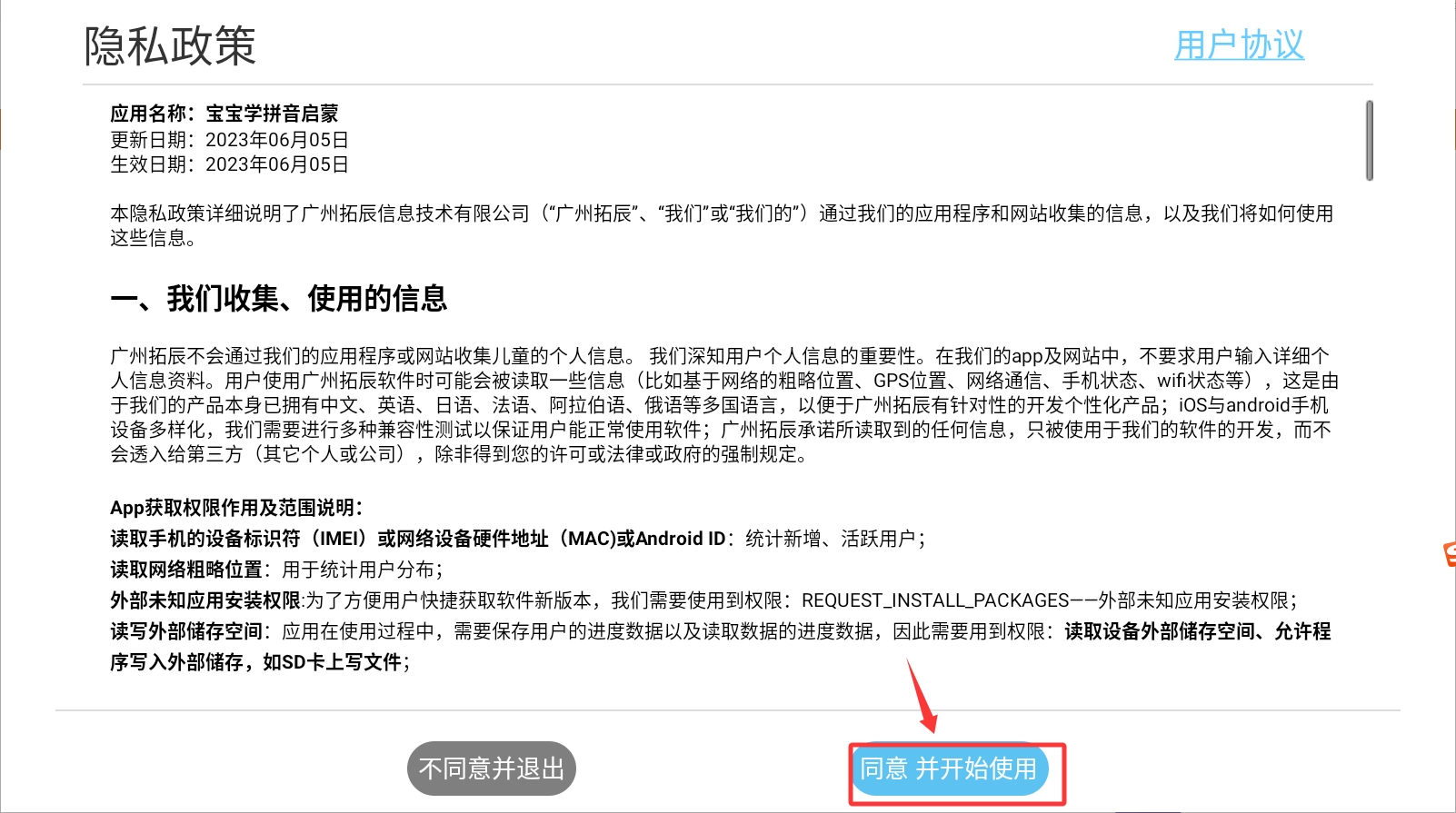 1、首次启动应用,请在隐私政策页面点击同意并开始使用。