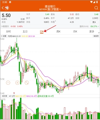 4、点击日k,就能看到日K线图的情况。