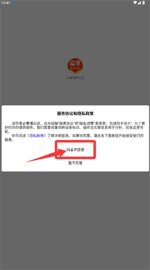 1、首先阅读服务协议与隐私政策,确认后点击同意并接受选项。