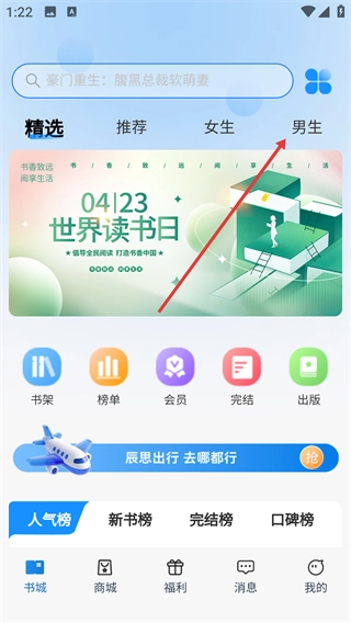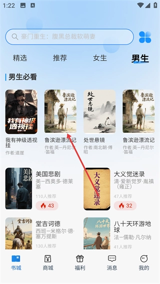 1、在书城页面点击顶部的【男生】分类标签,即可切换到男生向书籍的展示列表,进而浏览该类型的作品。