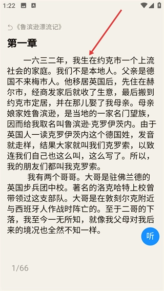 4在阅读页面,用户既能浏览书籍的主体内容,也可借助右侧的功能性按键(例如“听”键)开启听书模式,以此为阅读过程提供辅助。
