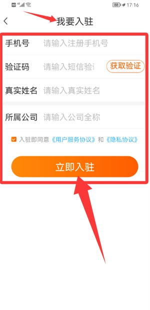 4、在入驻资料页填写手机号、姓名、企业信息等内容,提交申请即可完成。