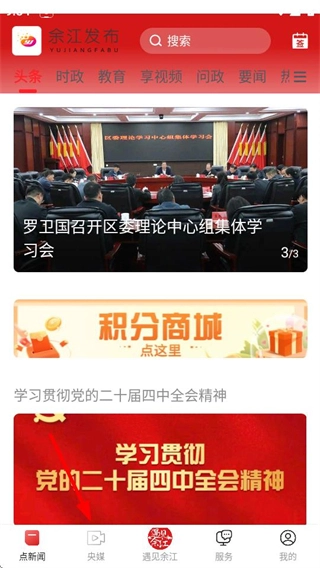 1在余江发布的主页面,点击页面底部导航栏中的央媒入口,即可跳转至央媒相关内容的展示页面。