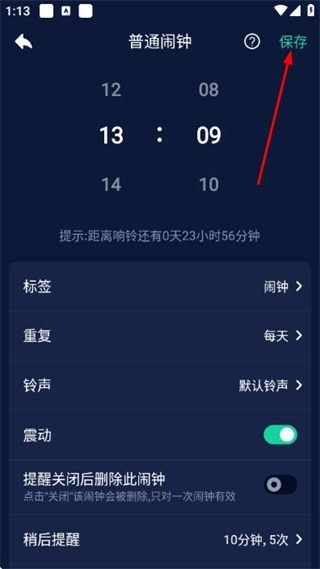 4、在普通闹钟设置页面点击右上角的保存,完成该闹钟的铃声修改操作。