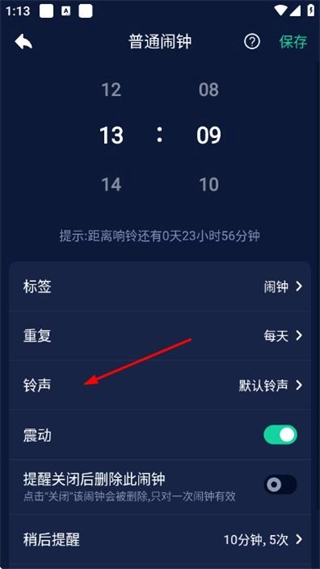 2、在普通闹钟设置页面点击铃声选项,进入铃声选择页面。
