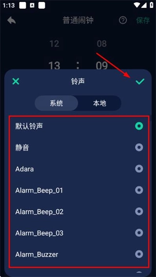 3、在铃声选择页面选定目标铃声后,点击右上角的对勾,返回普通闹钟设置页面。