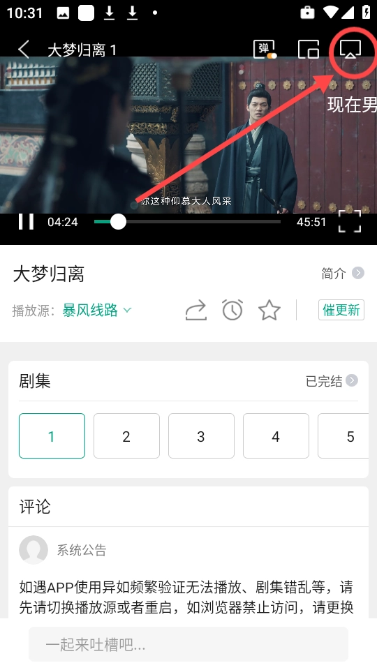 2、在应用播放界面右上角点击投屏按钮,即可将画面传输至电视屏幕上。
