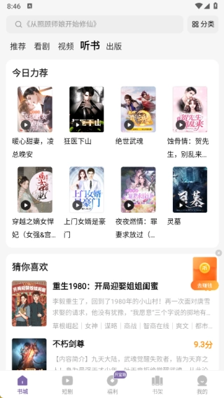 1、在书城页面中有听书、推荐、看剧、视频和出版等版块的内容;
