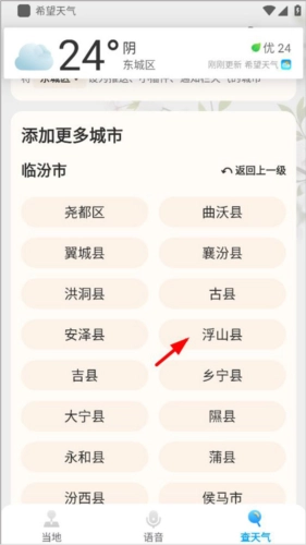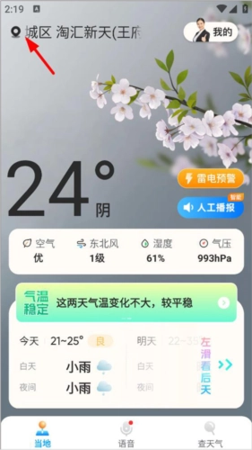 1、用户打开希望天气,进入当地主页,用户可查看当前天气、温度、小时预报、15日天气预报以及人工语音播报等,点击左上角定位刷新至最新位置;