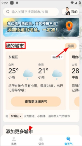 3、在我的页面中找到我的城市/添加更多城市,点击编辑;