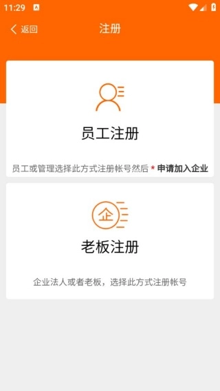 3、进入到注册界面,有员工注册,老板注册等去选择。