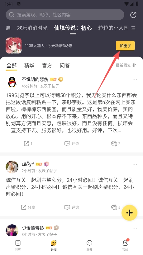 2挑选一个你感兴趣的圈子,找到页面右上角的“进圈”按钮,点击它就能加入该圈子。