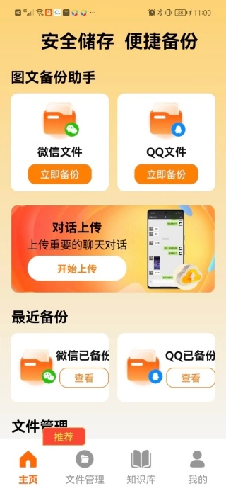 1主页支持微信与QQ文件的即时备份功能,还能通过对话上传的方式保存关键的聊天内容。