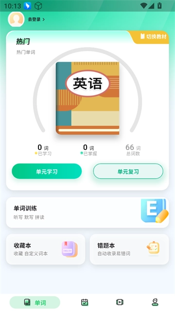 1、单词页面可以选择教材进行单元的学习与复习,还有单词训练等功能。