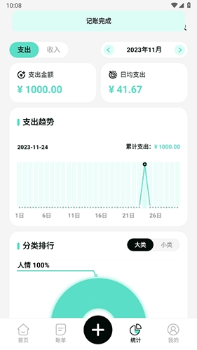 统计界面配备了多种可视化报表形式,包括趋势折线图、占比饼图、按类别排序的支出榜单以及按具体项目排列的消费明细榜单等,能让您直观掌握个人消费动态,精准定位消费行为中的潜在问题,进而提升财务管理的效率与科学性。