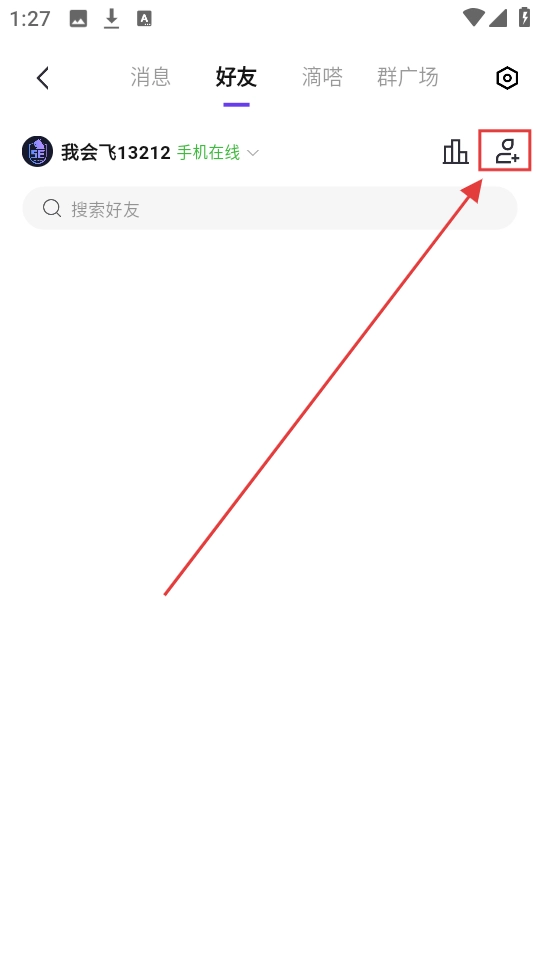 3、进入好友页面后,找到添加好友的图标并点击,即可进入添加好友的搜索界面。