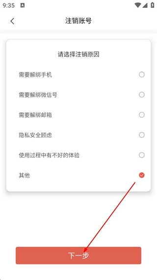5、在注销原因选择页面,选定注销原因后点击下一步,进入填写页面。