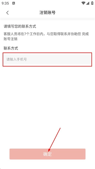 6、在联系方式填写页面,输入手机号后点击确定,提交账号注销申请。
