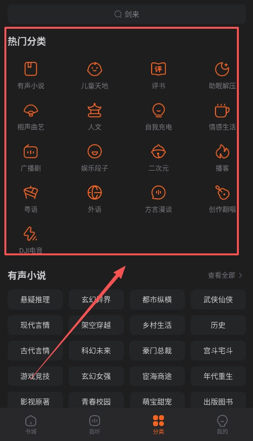 1、找书时,可以利用“热门分类”下的细分标签,比如在“有声小说”大类下,让你更快找到目标。