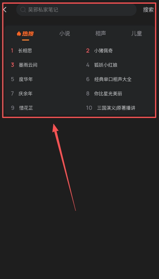 4、如果这些还找不到想要的,可以直接在顶部的搜索框输入书名、作者或主播名,这是最直接的找书方式。